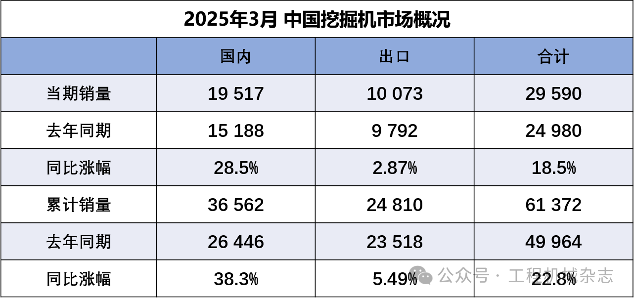 據中國工程機械工業協會對挖掘機主要制造企業統計,2025年3月銷售各類挖掘機29590臺,同比增長18.5%。其中國內銷量19517臺,同比增長28.5%;出口量10073臺,同比增長2.87%。2025年1—3月,共銷售挖掘機61372臺,同比增…......