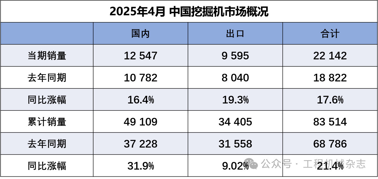 據中國工程機械工業協會對挖掘機主要制造企業統計,2025年4月銷售各類挖掘機22142臺,同比增長17.6%。其中國內銷量12547臺,同比增長16.4%;出口量9595臺,同比增長19.3%。......