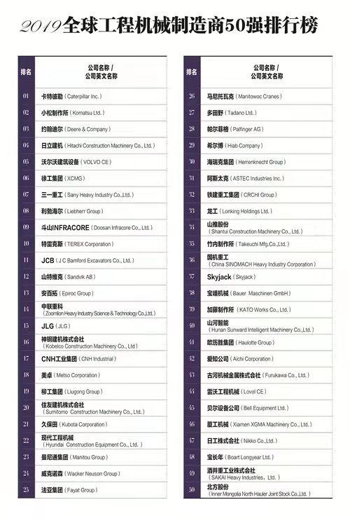 3日,2019年全球工程機(jī)械產(chǎn)業(yè)大會(huì)暨50強(qiáng)峰會(huì)發(fā)布的“2019全球工程機(jī)械制造商50強(qiáng)”榜單顯示,此次入榜企業(yè)共來(lái)自13個(gè)國(guó)家,50強(qiáng)在過(guò)去一年中,整體實(shí)現(xiàn)銷(xiāo)售額1910.09億美元。