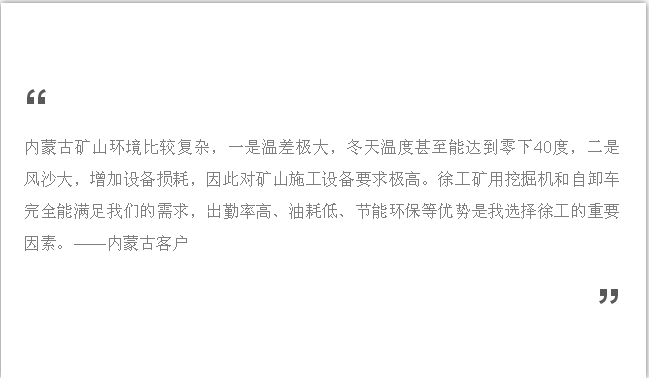 內(nèi)蒙古擁有豐富的鐵礦資源,對大型露天成套礦業(yè)裝備的需求高,并且急需大型礦業(yè)裝備推動當?shù)氐V山產(chǎn)業(yè)技術(shù)升級。徐工大型露天成套礦業(yè)裝備,經(jīng)過客戶實地走訪調(diào)研以及當?shù)氐V山市場環(huán)境嚴峻考核之后,憑借卓越性能成為了內(nèi)蒙古客戶心中平衡當?shù)鼐G色環(huán)保和經(jīng)濟發(fā)展、值得信賴的首選品牌。