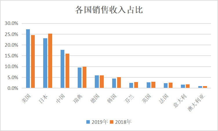 從國家來看,各國銷售收入占比排名前三的國家分別是美國、日本和中國,2019年這三個國家的銷售收入占比分別為27.3%、23.1%和17.7%,累計占比達到了68.1%。