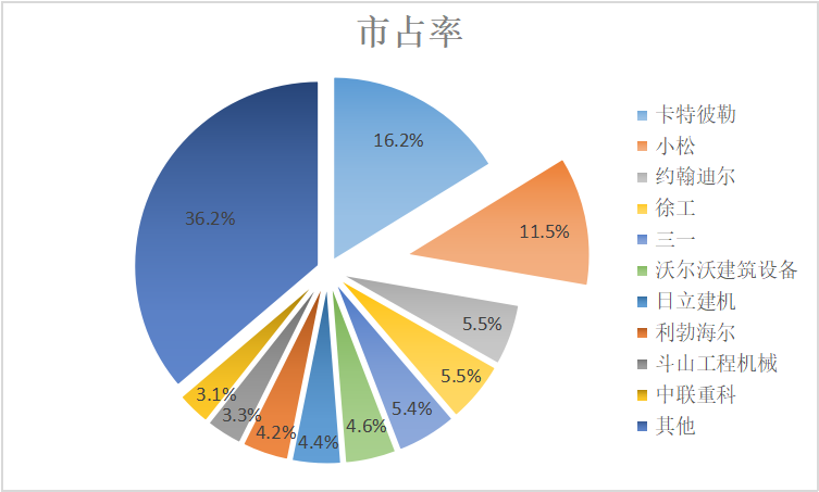 2020全球工程機械50強排名前10的分別是卡特彼勒、小松、約翰迪爾、徐工集團、三一重工、沃爾沃建筑設備、日立建機、利勃海爾、斗山工程機械和中聯重科。前十大企業占據全球市場份額超過60%,達到了63.7%。