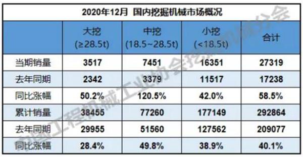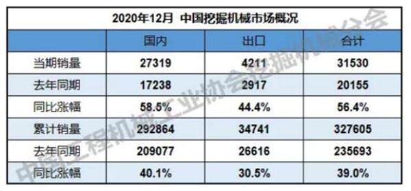 2020年12月,共計銷售各類挖掘機械產品31,530臺,同比漲幅56.4%。國內市場銷量27,319臺,同比漲幅58.5%。出口銷量4,211臺,同比漲幅44.4%。