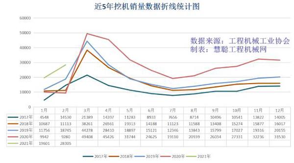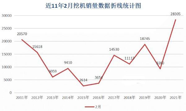 2021年2月挖掘機銷量數據創2月歷史新高,之前最高年份為2011年2月的20570臺,2021年2月的28305臺,超出2011年2月約38%。2021年1-2月累計4.79萬臺,比2011年1-2月累計3.17萬臺,超過約51%。