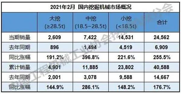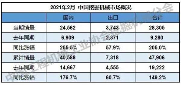 根據中國工程機械工業協會行業統計數據,2021年1—2月納入統計的26家主機制造企業,共計銷售各類挖掘機械產品47,906臺,同比漲幅149.2%。其中,國內市場銷量40,588臺,同比漲幅176.7%;出口銷量7,318臺,同比漲幅60.7%。