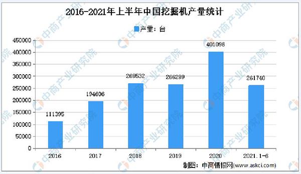 從近幾年工程機械的發展來看,挖掘機的發展相對較快,挖掘機已經成為工程建設中最主要的工程機械之一。數據顯示,2016-2020年我國挖掘機產量整體增長趨勢,2021年1-6月我國挖掘機產量達261740臺,同比增長25.6%。