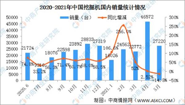 數據顯示,2021年5月銷售各類挖掘機27220臺,同比下降14.3%;其中國內22070臺,同比下降25.2%;出口5150臺,同比增長132%。2021年1-5月,共銷售挖掘機200733臺,同比增長37.7%;其中國內176735臺,同比增長31.7%;出口23998臺,同比增長106%。