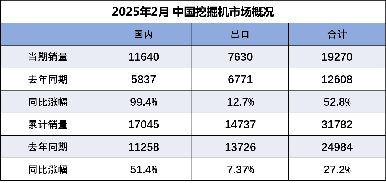 據中國工程機械工業協會對挖掘機主要制造企業統計,2025年2月銷售各類挖掘機19270臺,同比增長52.8%。其中國內銷量11640臺,同比增長99.4%;出口量7630臺,同比增長12.7%。